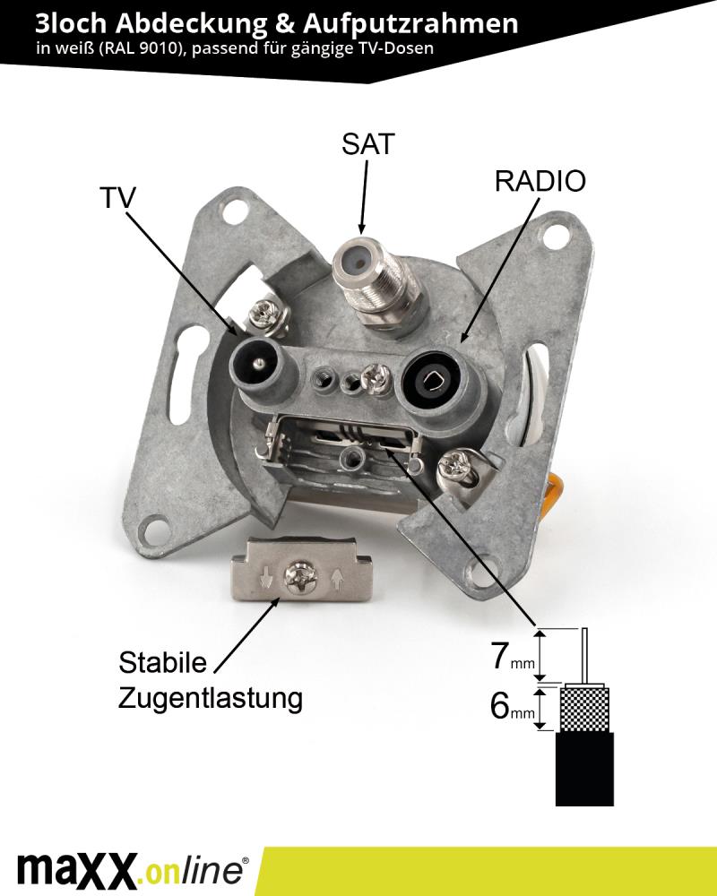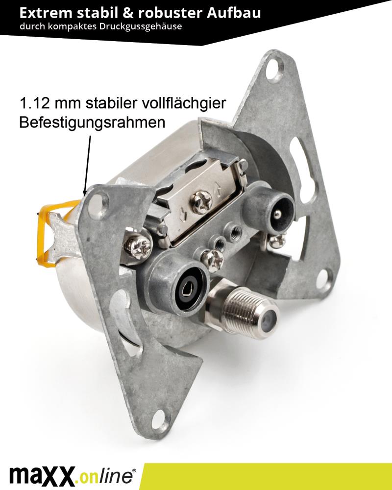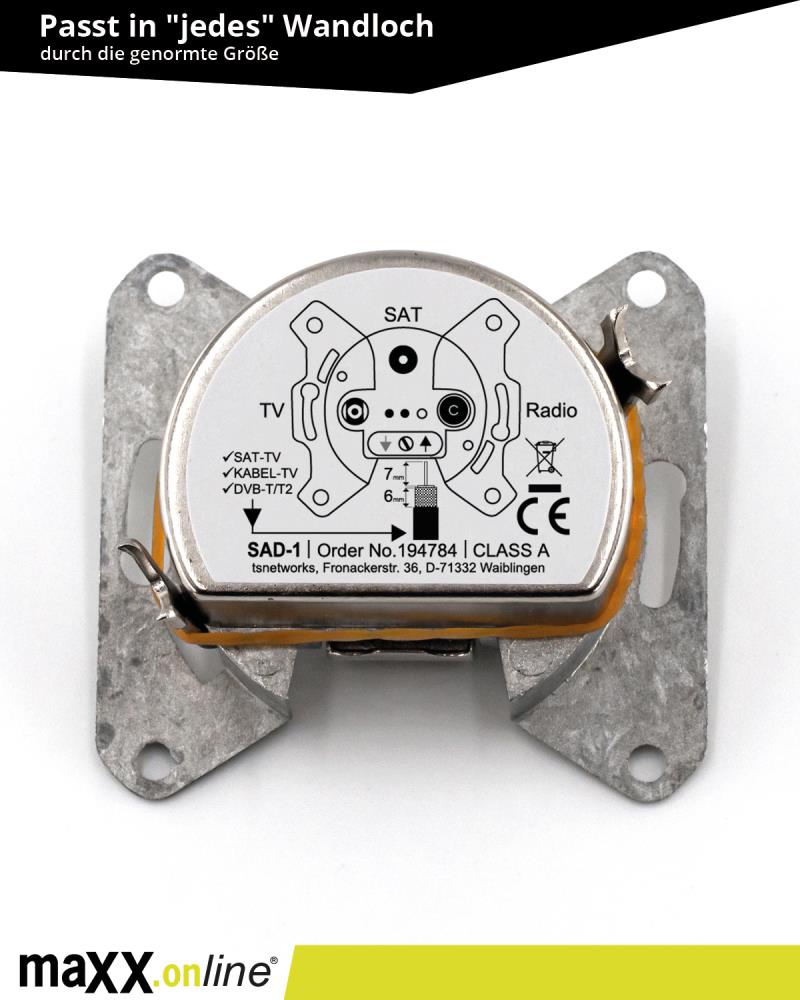 Die SAD-1 3loch Sat-Antennensteckdose von maxx.onLine kann dank modernster Technik, universell in Sat- oder Kabelfernsehen Anlagen eingesetzt werden.