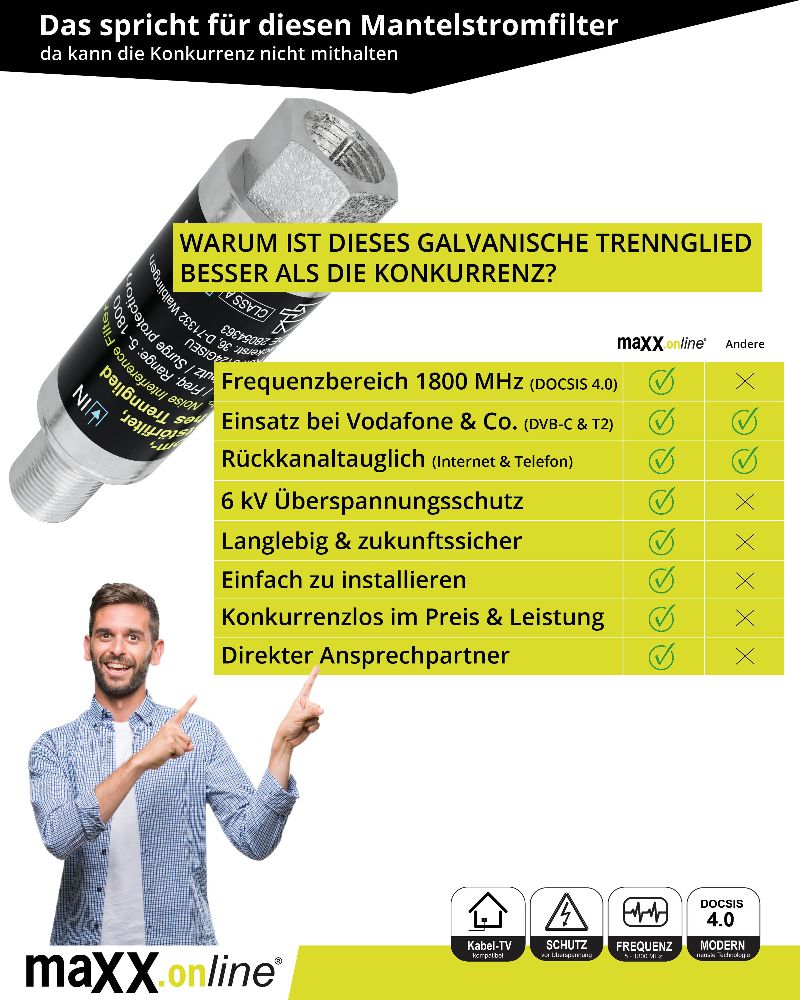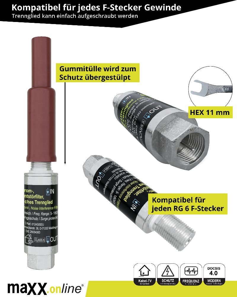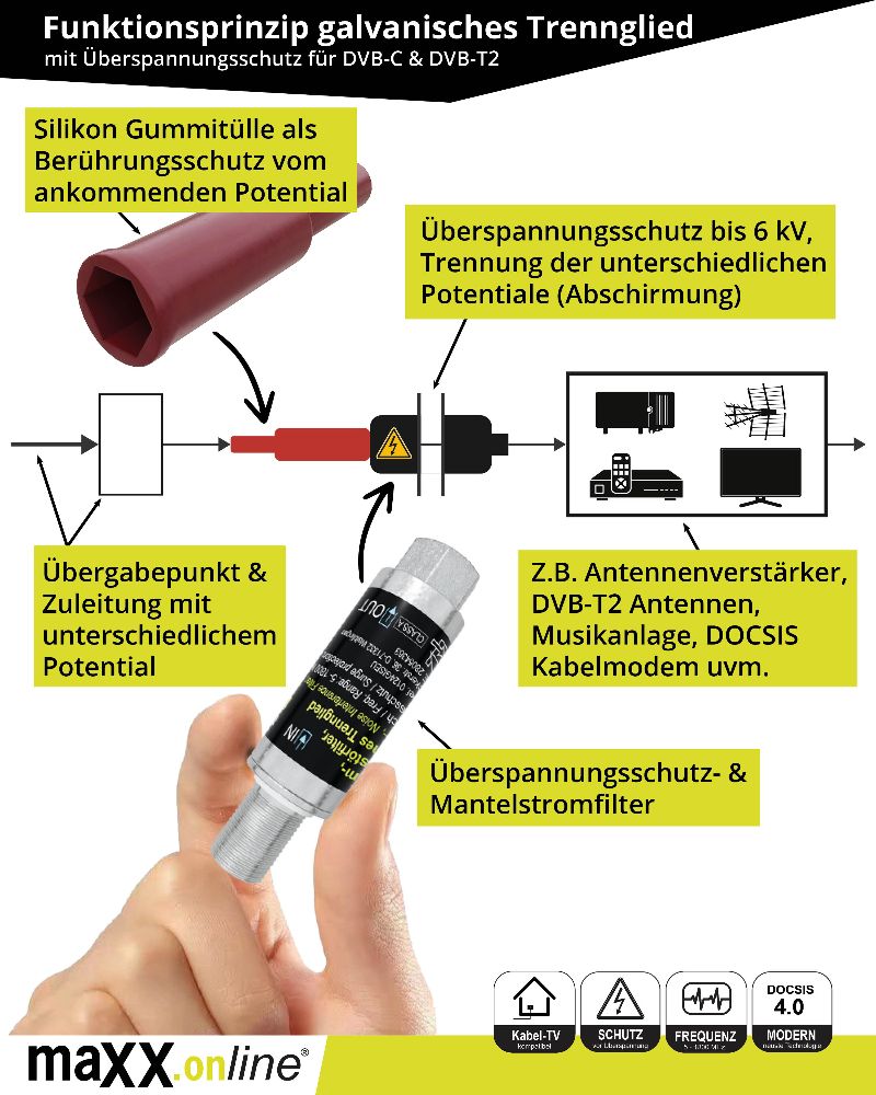 - Zur Vermeidung von Ausgleichsströmen zwischen unterschiedlichen Potenzialen Kapazitive Trennung von Innen- und Außenleiter, trennt Masse von Antennen und Empfangsgeräten (z.B. Fernseher, Receiver, Radiotuner, Kabelmodems, Antennenverstärker uvm.)