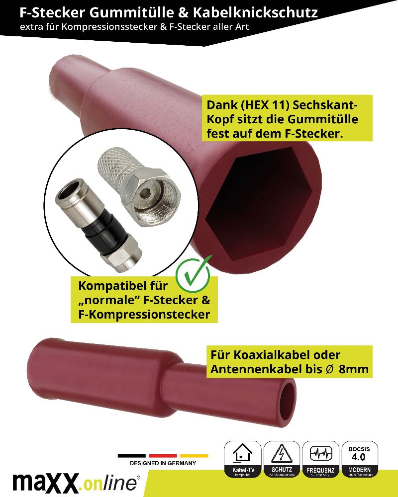 Dabei ist darauf zu achten, dass das ankommende Koaxialkabel mit F-Stecker vom Hauptübergabepunkt berührungssicher mithilfe der F-Stecker Gummitülle versteckt wird. Somit entsteht automatisch ein Schutz gegen gefährliche Berührspannungen.