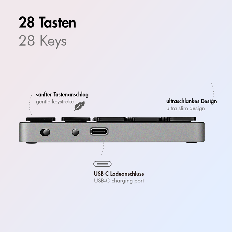 Kabelloses 28-Tasten-Keypad mit BT 5.0, Scherenmechanik, Space-grau
