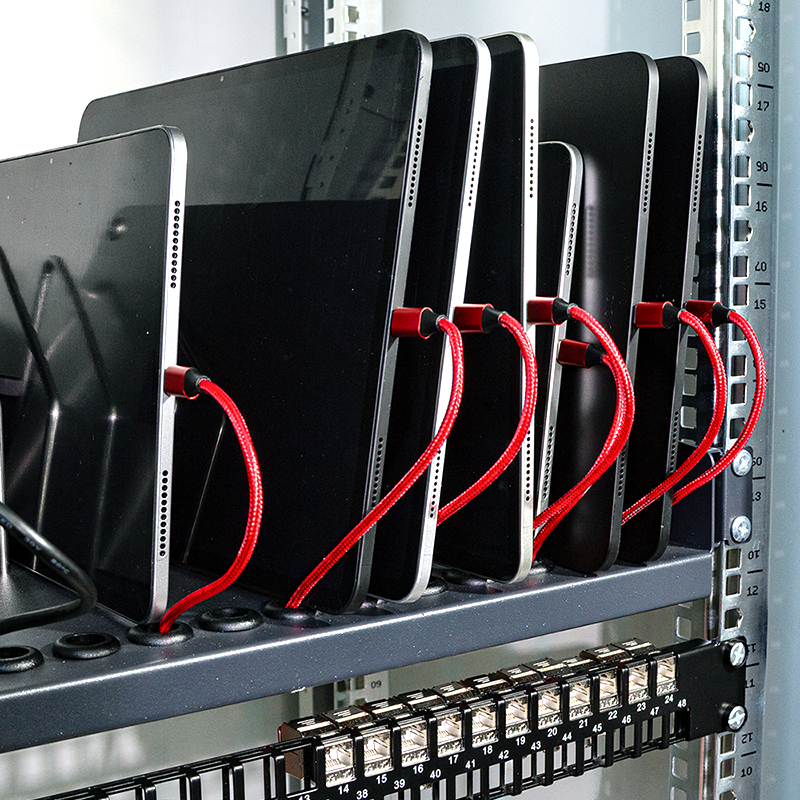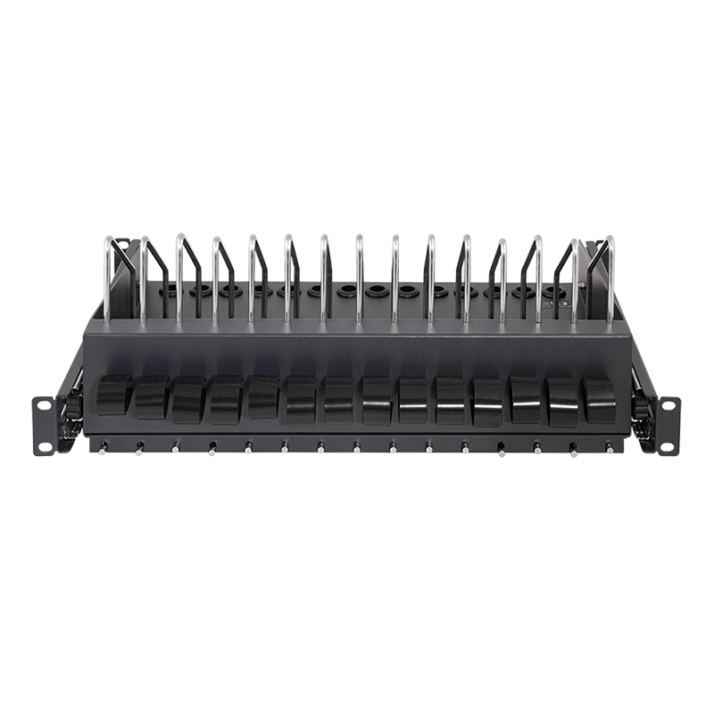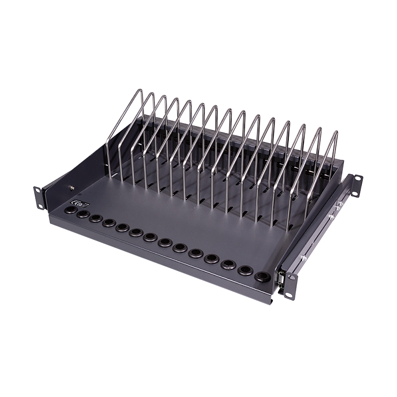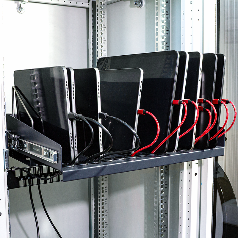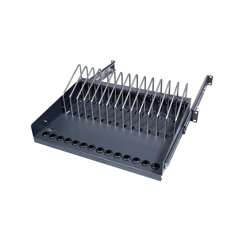 Dieser Fachboden ist ideal für die Unterbringung von tragbaren Geräten in einem 19"-Schrank. In den Fächern können bis zu 14 Geräte einfach untergebracht werden. An der Vorderseite befinden sich Öffnungen für die Ladekabel. Für einen optimalen Zugriff kann der Einlegeboden herausgezogen werden.