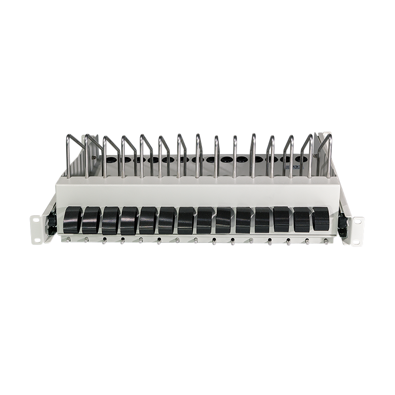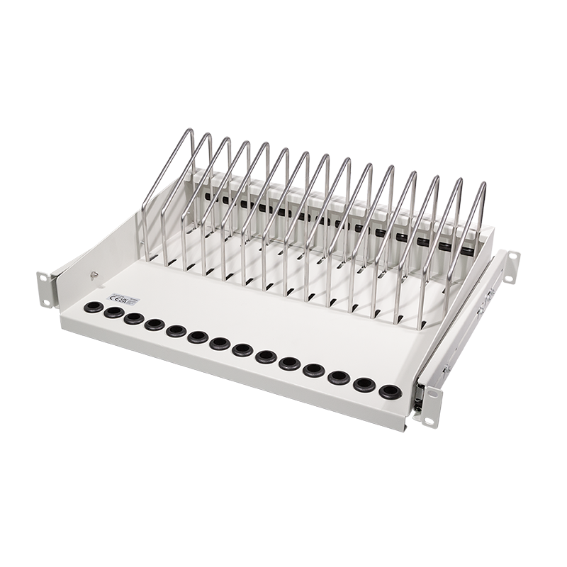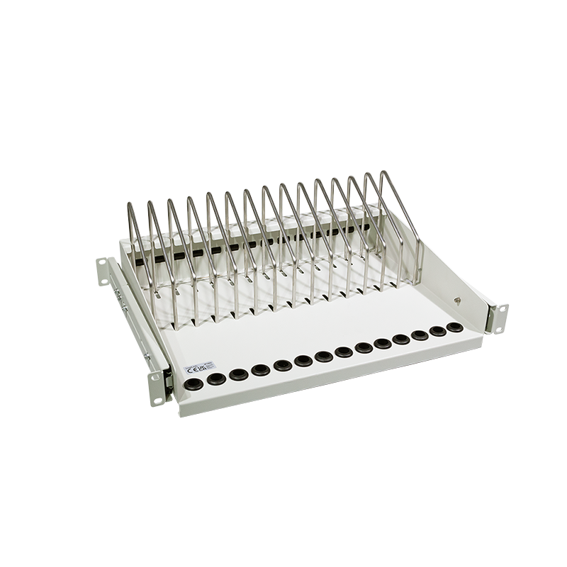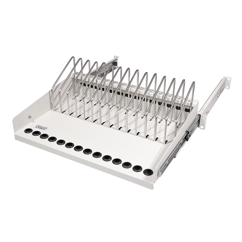Dieser Fachboden ist ideal für die Unterbringung von tragbaren Geräten in einem 19"-Schrank. In den Fächern können bis zu 14 Geräte einfach untergebracht werden. An der Vorderseite befinden sich Öffnungen für die Ladekabel. Für einen optimalen Zugriff kann der Einlegeboden herausgezogen werden.