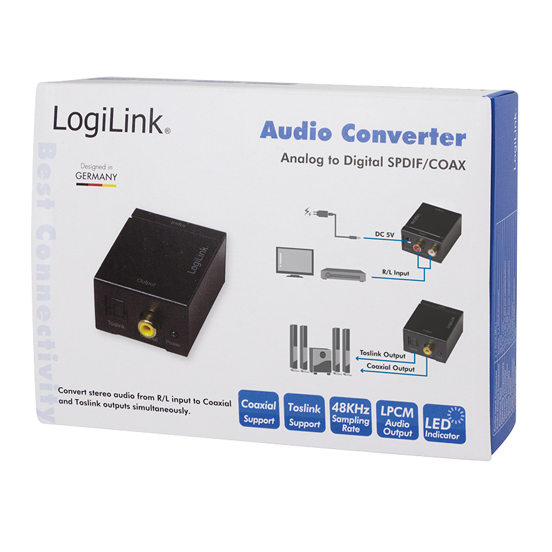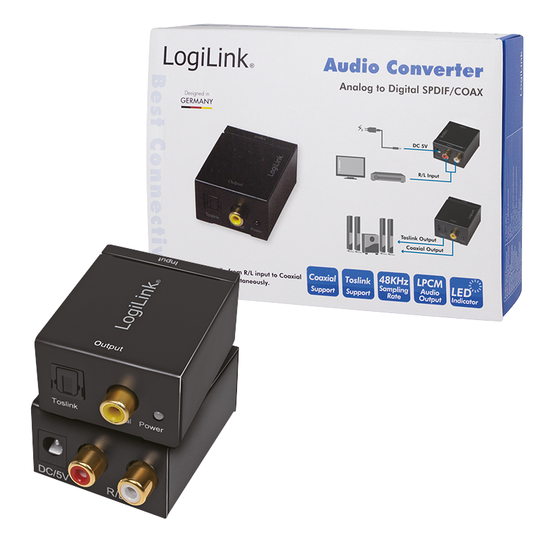 Der Analog-Digital Audio-Konverter wandelt analoge L/R-Audiosignale gleichzeitig in digitale Koaxial- und Toslink-Audiosignale um. Die digitale Audiosignalausgabe geschieht als unkomprimierte 2-Kanal LPCM mit einer Abtastrate von 48 kHz. Ideal für den Heimgebrauch oder professionelle Audio-Bereich.
