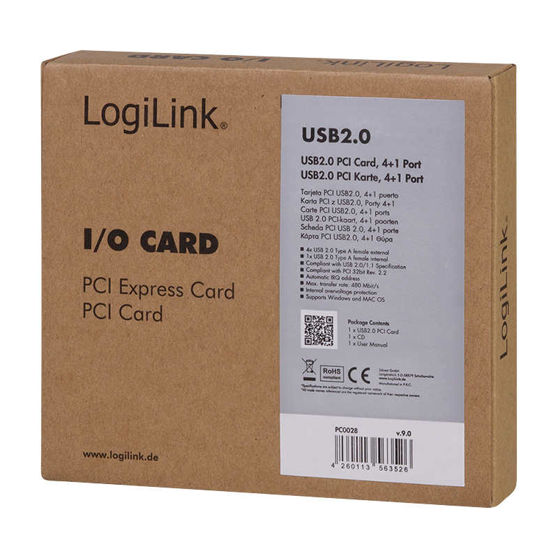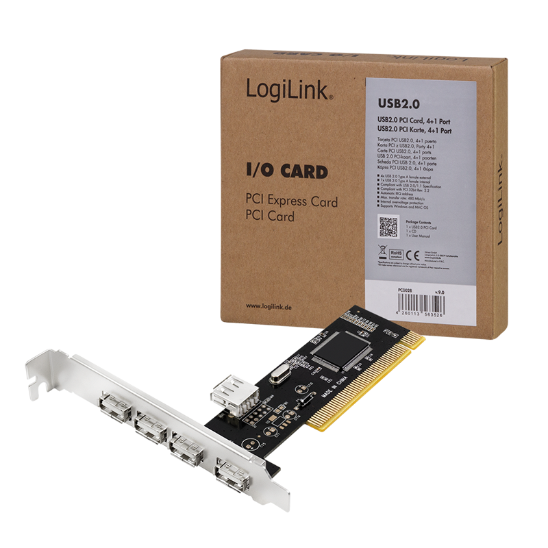 Logilink Erweiterungskarte für Ihren PCs um vier externe und eine interne USB 2.0 Schnittstelle für den Anschluss von kompatiblen Geräten (auch abwärtskompatibel zu USB 1.1). Sie wird in einen freien PCI Slot Ihres PCs eingebaut und von aktuellen Betriebssystemen dank Plug-and-Play (PnP) automatisch erkannt. Die automatische IRQ Adressierung verhindert dabei Adresskonflikte. Die internen und externen Anschlüsse sind genormt und funktionieren in jedem PC.