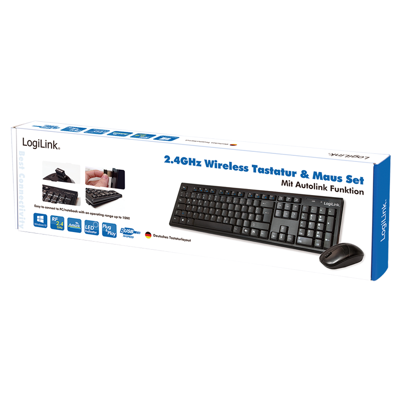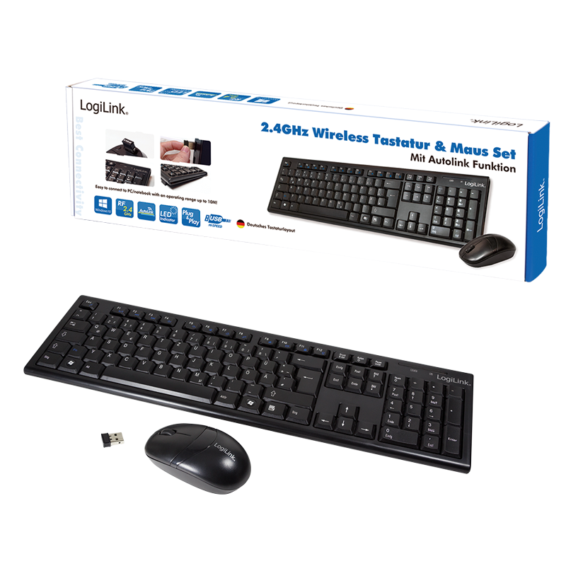 Kombination aus Tastatur und Maus mit 2.4 GHz Technologie von LogiLink. Die Maus mit optischem Sensor gewährleistet bei 1000 dpi Abtastung höchste Präzision und schnelles Arbeiten. Der Anschluss erfolgt über den mitgelieferten USB Micro Dongle. Dieser erkennt die Geräte durch die Autolink Funktion automatisch. Die Tastatur hat zusätzlich 13 Hotkeys für Email, Favoriten, Mediaplayer etc.