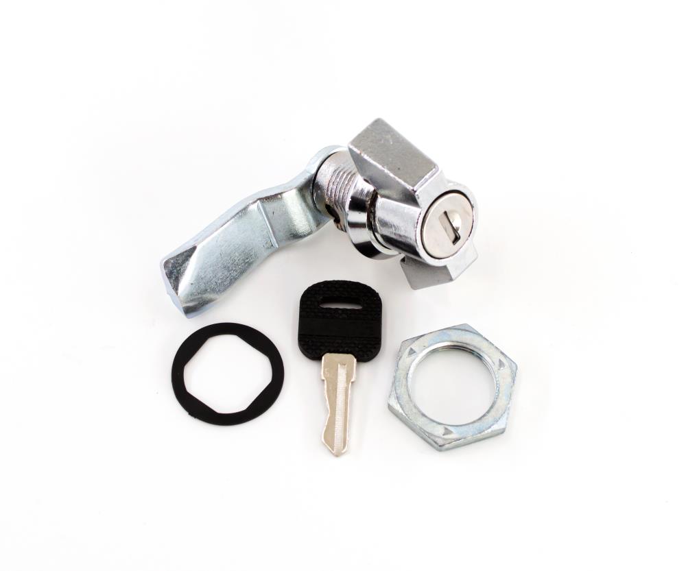 1x Zylinderschloss, 1x Gegenmutter, 1x Gummiunterlegscheibe, 1x Schlüssel