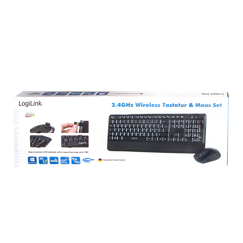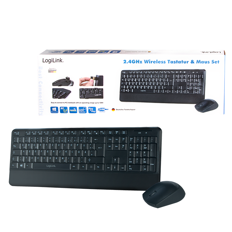 Die kabellose Tastatur Maus Kombination von LogiLink besteht aus einer flachen Tastatur und einer schwarzen Maus. Die Tastatur ist besonders flach und hat einen angenehmen Anschlag. Das mitgelieferte Dongle wird über den USB Port des Computers verbunden und ermöglicht Ihnen die Tastatur und Maus kabellos zu benutzen.