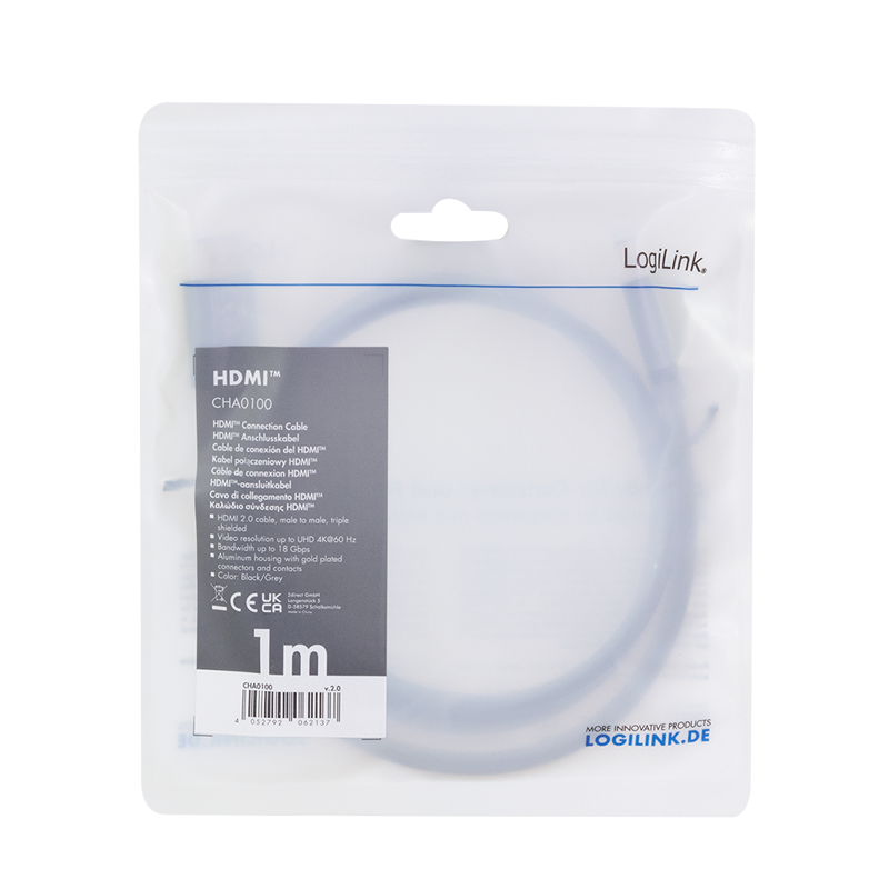 Das HDMI-High-Speed-Anschlusskabel mit Ethernet von LogiLink überträgt Audio, Video und Daten. Es unterstützt Auflösungen bis zu 4K/60 Hz (3840 x 2160) und 3D. Die vergoldeten Stecker garantieren zudem einen optimalen Kontakt.