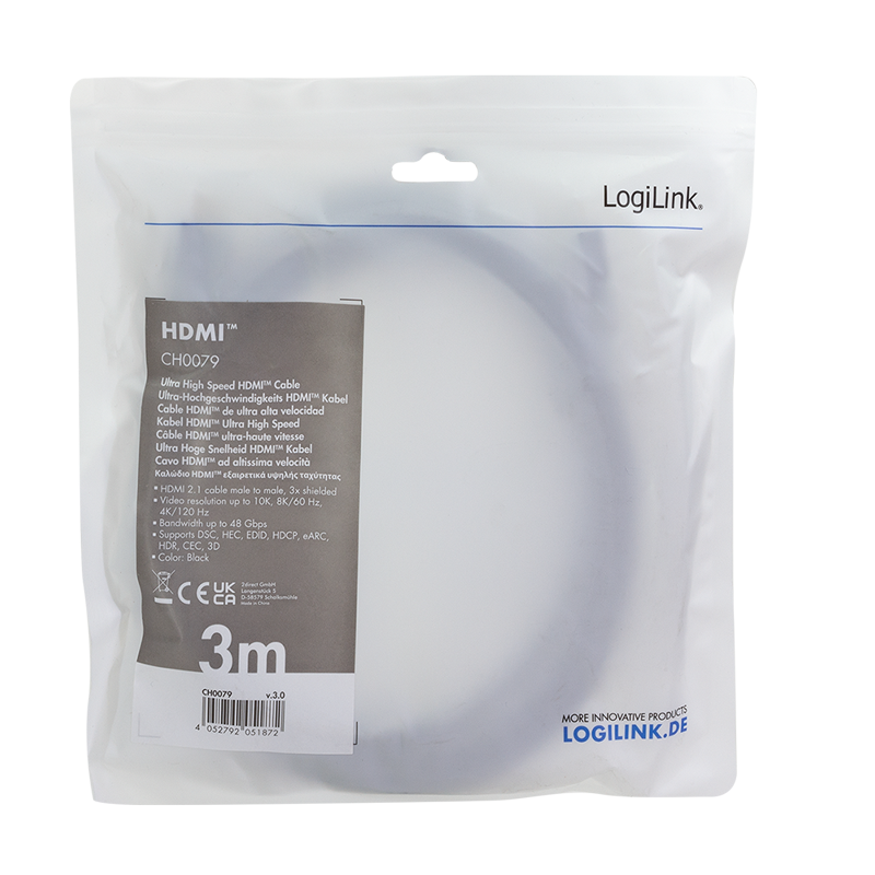 Das ultrahochleistungsfähige HDMI-Kabel von LogiLink überträgt Audio und Video Daten. Es unterstützt Auflösungen bis zu 10K, 8K/60 Hz und 4K/120 Hz.