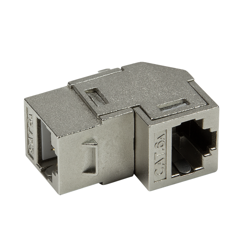 Geschirmte RJ45 Durchführungskupplung, 90° gewinkelt, für die Verbindung zweier RJ45 Patchkabel. Mit Einrastvorrichtung für den Einbau in 19" Keystone Panels. Geeignet für Cat.5e, Cat.6 und Cat.6A Verkabelungen.