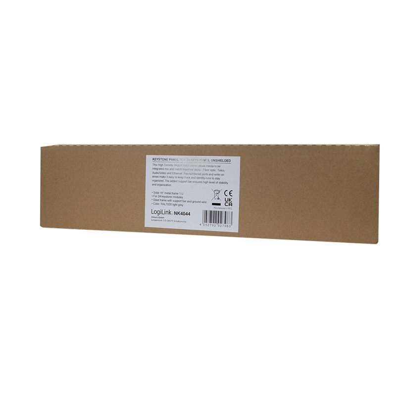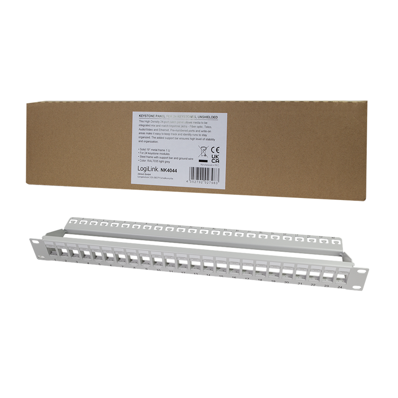 19" Verteilerfeld für die Aufnahme von maximal 24 Modulen mit schmaler Bauform. Die Module rasten ohne weiteres Montagezubehör mühelos in den 19" Verteilerfeld-Rahmen ein. Dieses Panel eignet sich optimal für Cat.5 oder Cat.6 Keystone Module mit einer max. Breite von 15,8 mm. Nur 1 HE Bauhöhe.