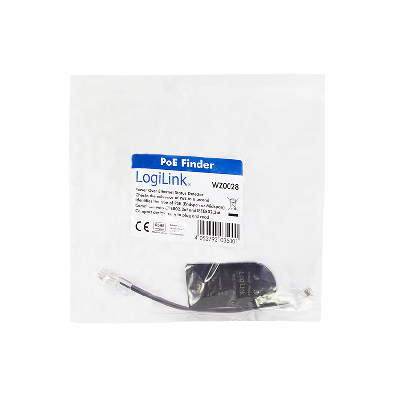 Mit LogiLink’s POE Finder schnell und einfach vor Ort alle Netzwerk-Datenports auf Power Over Ethernet Spannungsversorgung prüfen. Der neue, einfach zu bedienende Tester von LogiLink zeigt an, ob eine PoE Spannung vorhanden ist und wenn ja, auf welchen Aderpaaren (1-2/3-6 oder 4-5/7-8).