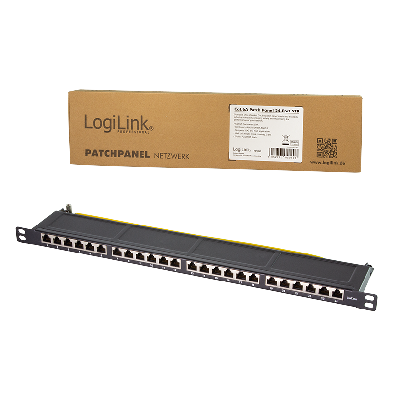 Cat.6A Patchpanel 24 Ports geschirmt, 19 Zoll Einbau, nur 0,5 HE, schwarz