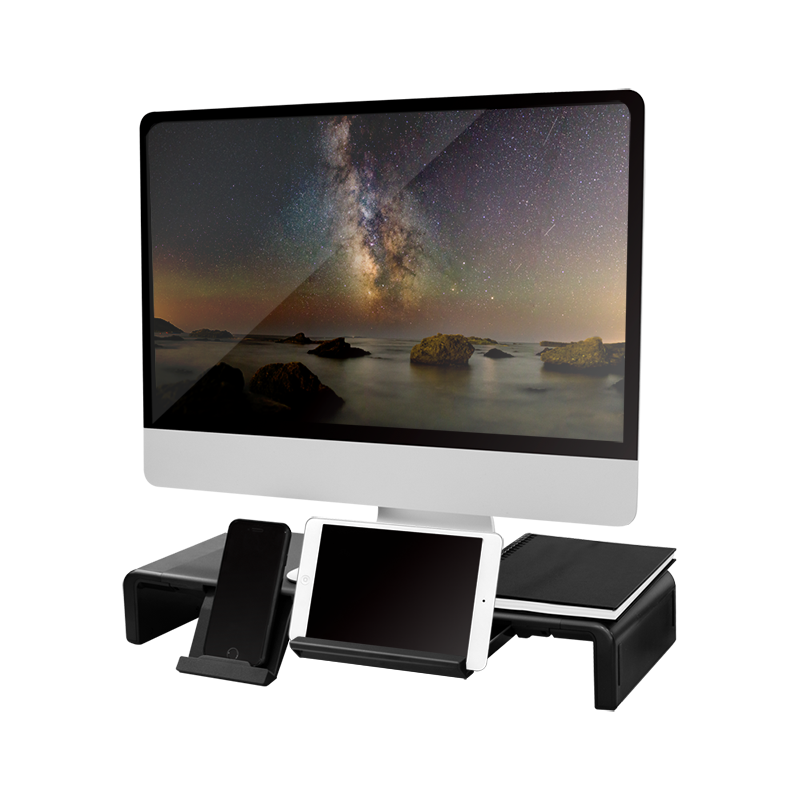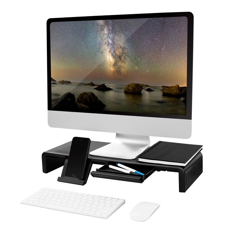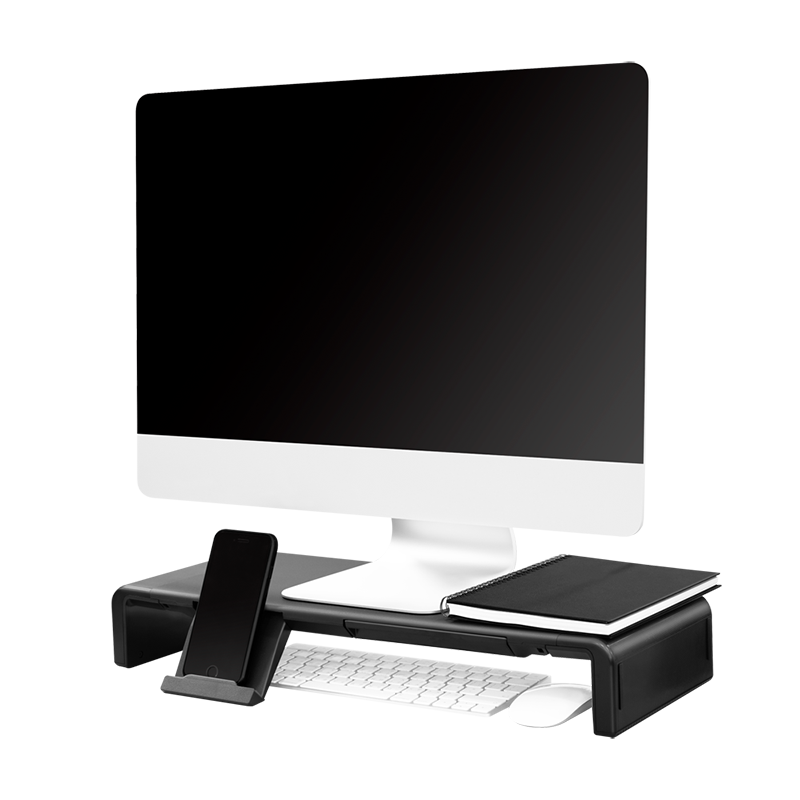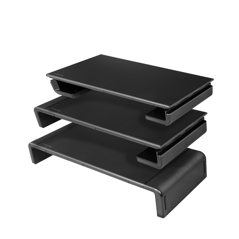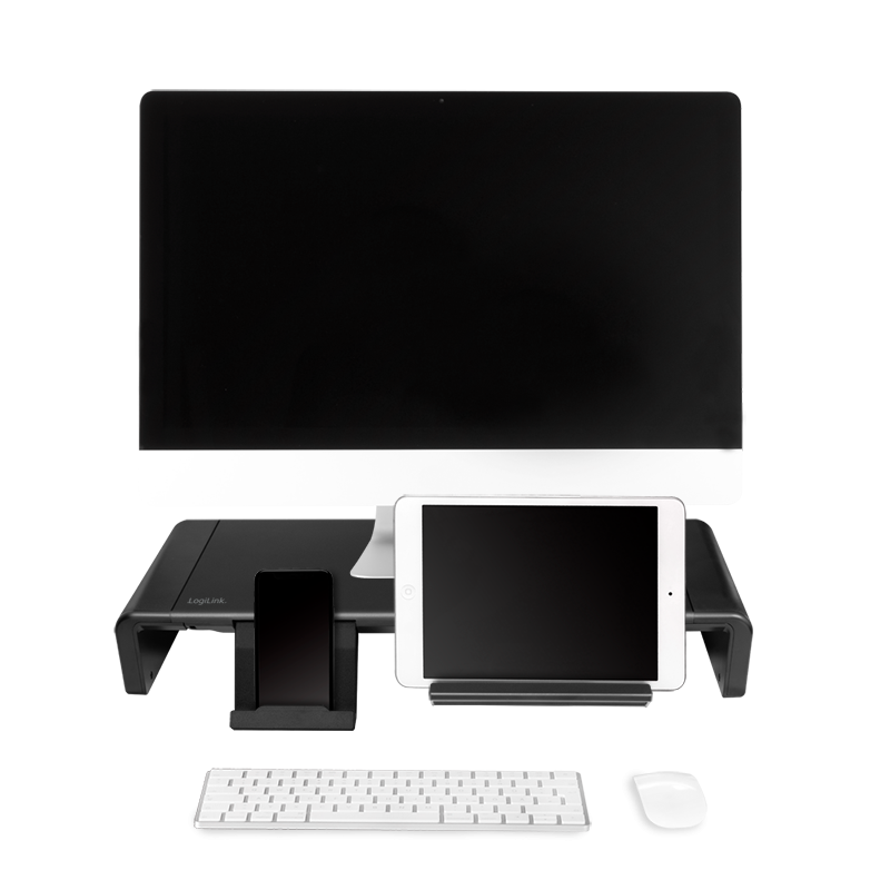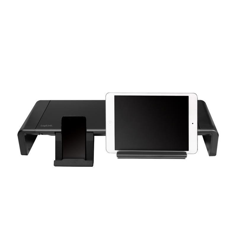 Der perfekte ergonomische Arbeitsplatz! Die zusammenklappbare Konstruktion ermöglicht es Ihnen, die Breite (420/470/520 mm) ganz nach Ihren Bedürfnissen einzustellen. An der Unterseite des Metall- und Kunststoffständers kann eine Tastatur und Maus untergebracht werden. Das Besondere an der LogiLink-Monitorerhöhung ist das eingebaute Schubladendesign in Kombination mit der Halterung für Smartphone und iPad. So finden auch kleine Gegenstände sauber und organisiert ihren Platz.