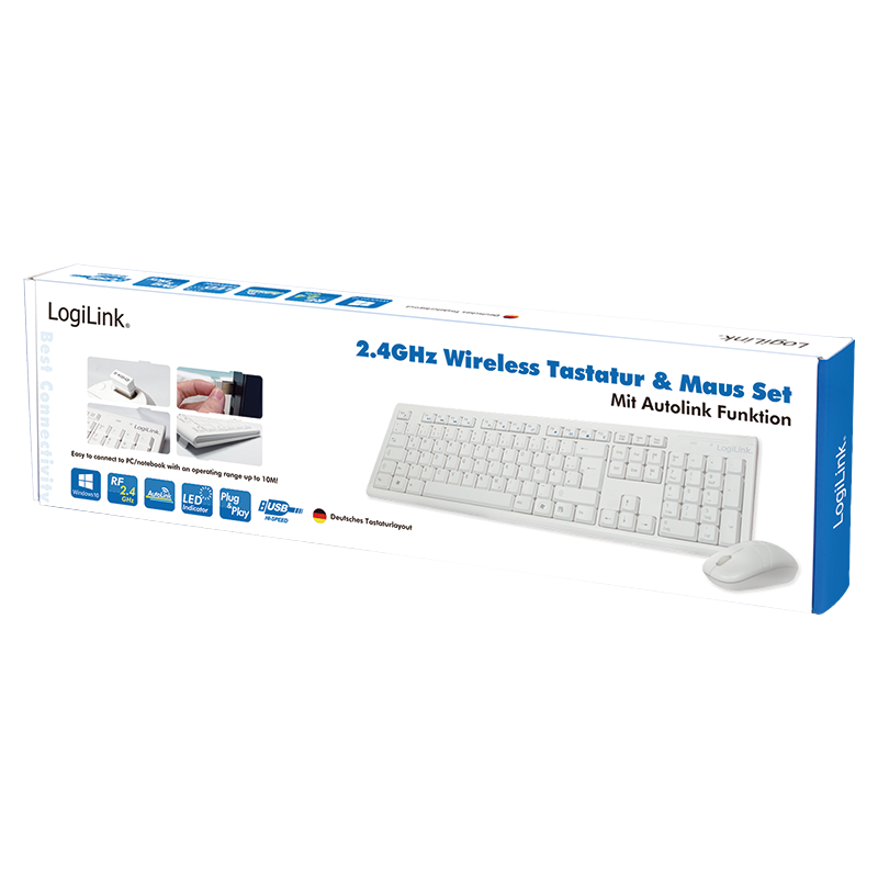Kombination aus Tastatur und Maus mit 2.4 GHz Technologie von LogiLink. Die Maus mit optischem Sensor gewährleistet bei 1000 dpi Abtastung höchste Präzision und schnelles Arbeiten. Der Anschluss erfolgt über den mitgelieferten USB Micro Dongle. Dieser erkennt die Geräte durch die Autolink Funktion automatisch. Die Tastatur hat zusätzlich 13 programmierbare Hotkeys für Email, Favoriten, Mediaplayer etc.