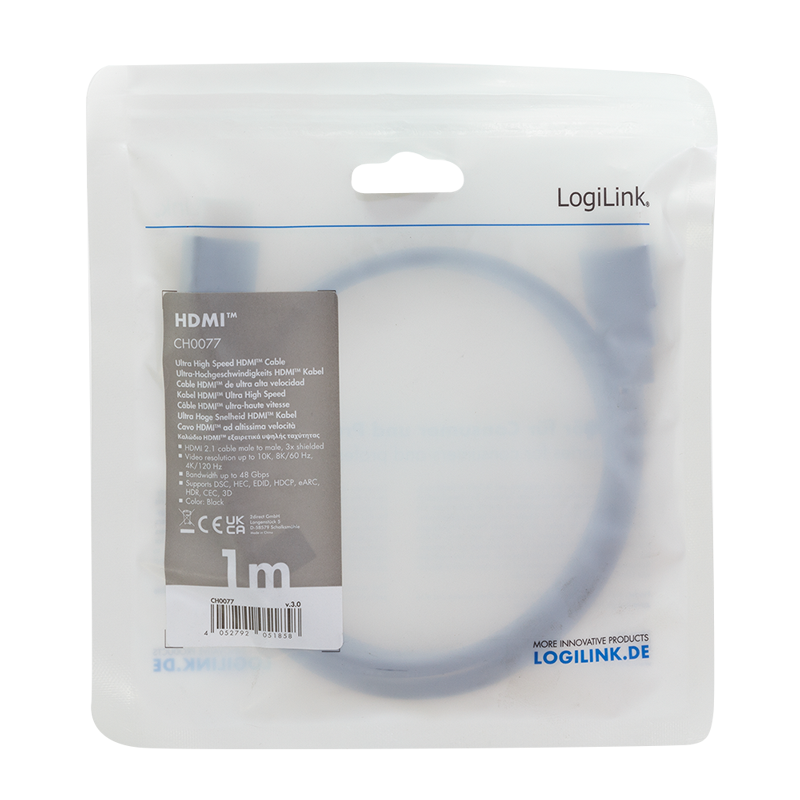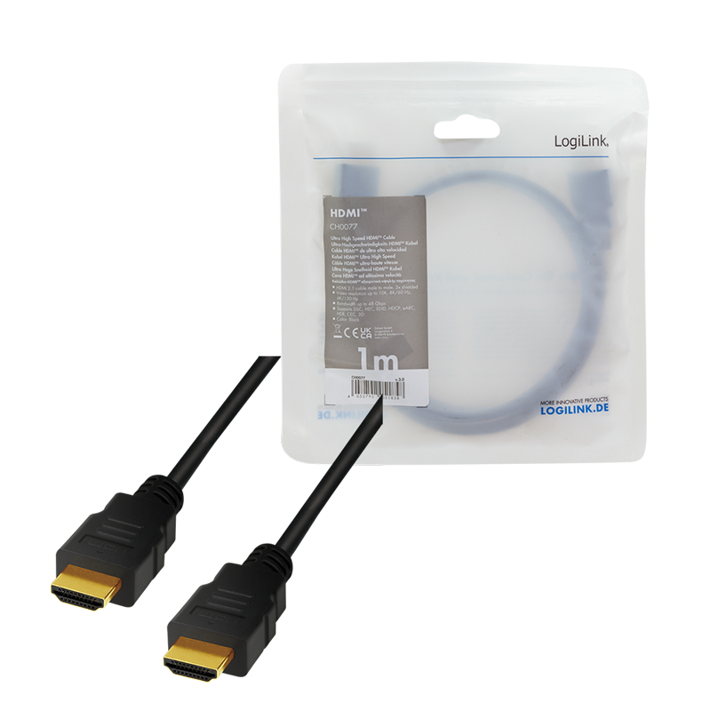 Das ultrahochleistungsfähige HDMI-Kabel von LogiLink überträgt Audio und Video Daten. Es unterstützt Auflösungen bis zu 10K, 8K/60 Hz und 4K/120 Hz.