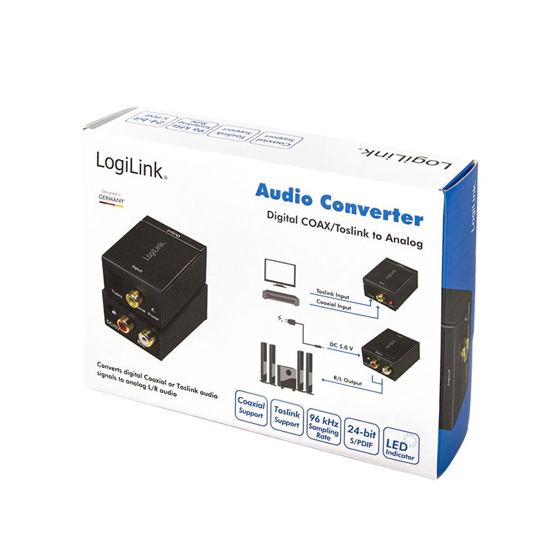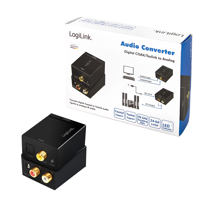 - Konvertiert digitale koaxial oder Toslink Audiosignale zu analog L/R