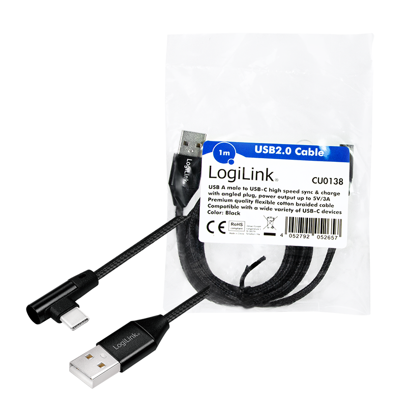 Produktinformationen "USB 2.0 Type-C Kabel, C/M (90°) zu USB-A/M, Stoff, schwarz, 1 m"