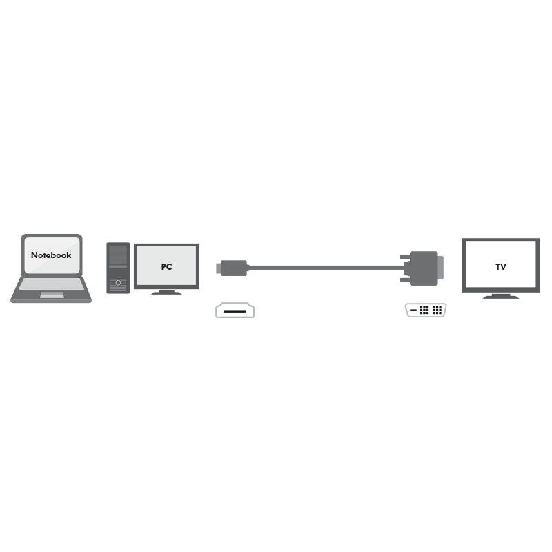 Dieses Kabel ermöglicht den Betrieb von HDMI Endgeräten an Peripherien mit DVI Anschluss wie Plasma, LCD Fernseher, Beamer oder PC Monitoren sowie auch umgekehrt den Betrieb von DVI Endgeräten am HDMI Peripherien.