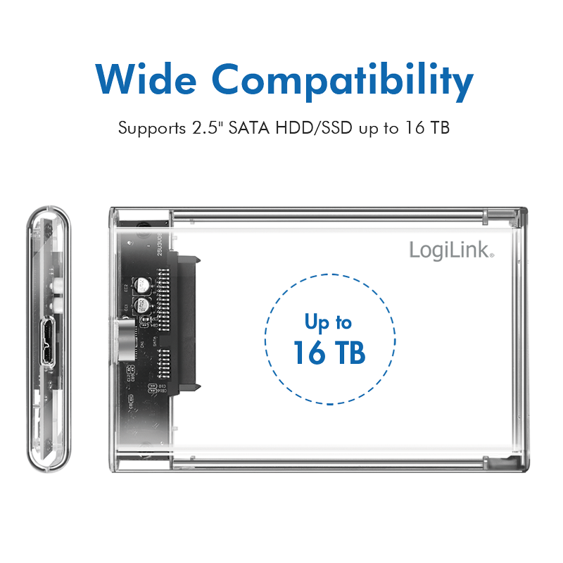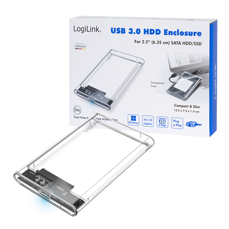 Externes Gehäuse von LogiLink zum Einbau und Betrieb von 2,5" SATA I/II/III HDD/SSD bis zu 16 TB Festplatten. Der Anschluss erfolgt am PC oder Notebook über die schnelle USB 3.0 Schnittstelle. USB ist die Abkürzung für Universal Serial Bus und arbeitet mit einer Übertragungsrate von bis zu 5 Gbit/s. Der Anschluss ist kinderleicht und das Gerät wird von modernen Betriebssystemen automatisch erkannt. Das werkzeuglose Design ermöglicht es Ihnen eine Festplatte besonders leicht einzubauen bzw. zu wechseln.