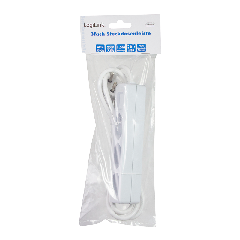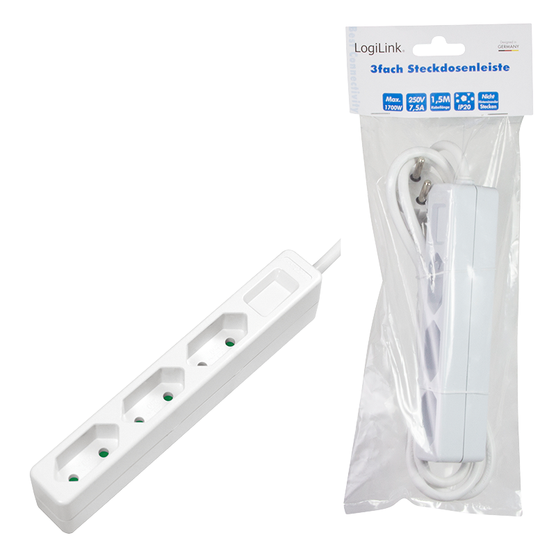 LogiLink’s 3-fach Euro-Steckdosenleiste ist durch ihre schlanke Bauweise besonders raumsparend und passt z.B. neben oder hinter Schränken. Sogar dort, wo die üblichen Steckdosenleiste nicht genügend Platz finden. Bis zu drei elektrische Verbraucher mit Euro-Stecker können gleichzeitig angeschlossen werden.Die Kabellänge beträgt 1,5m.