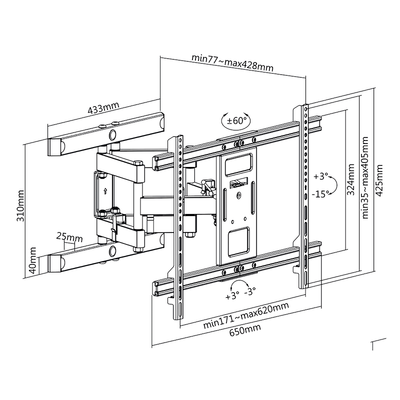 - Wandabstand: Wand <> TV-Rückseite: 77–428 mm