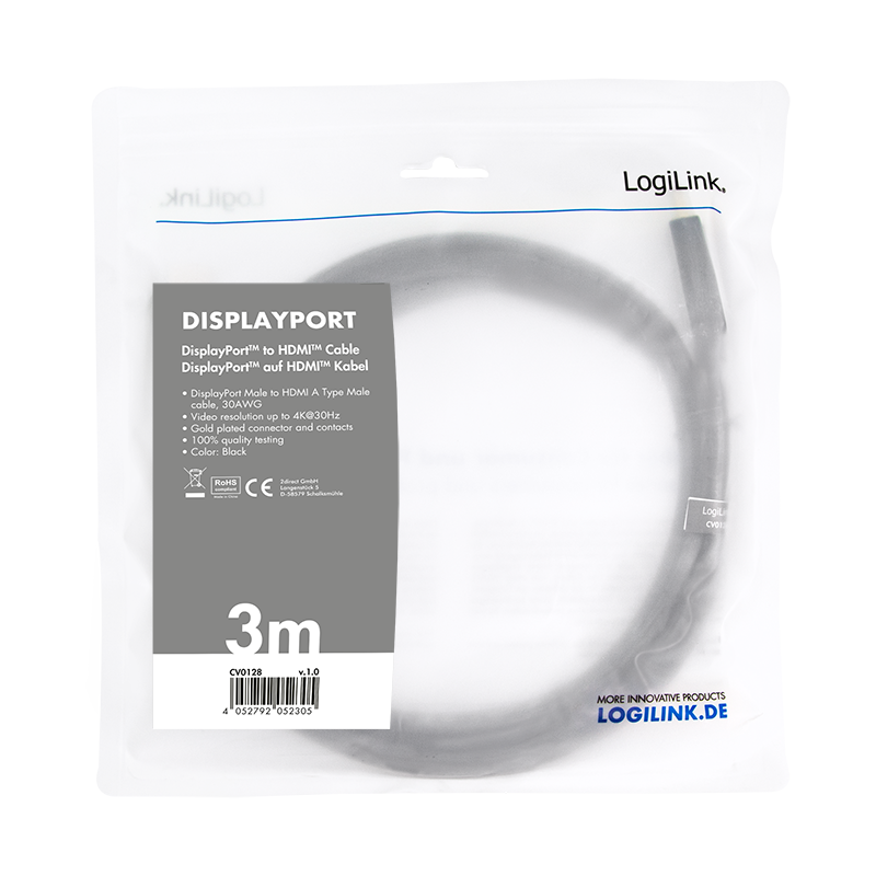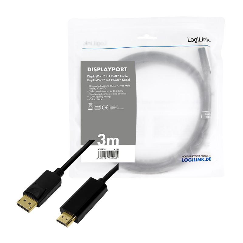 Das DisplayPort auf HDMI-Kabel von LogiLink eignet sich hervorragend für den Anschluss Ihres Computers an ein HDMI-Gerät. Es besitzt vergoldete Kontakte und eine Auflösung bis zu 4K x 2K.