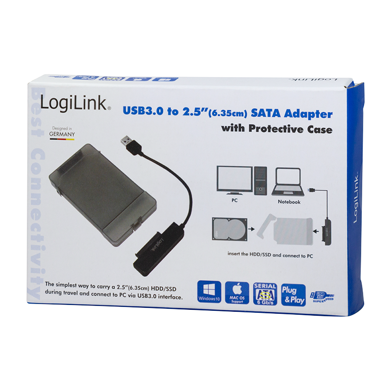 Transportieren Sie Ihre 2,5" SATA-Festplatte sicher von A nach B und schließen Sie sie ganz einfach per USB-Schnittstelle an Ihren Computer an. Der USB 3.0 auf 2,5" SATA Adapter mit passender Festplatten-Schutzhülle gibt Ihnen die Möglichkeit bedenkenlos Ihre Daten überallhin mitzunehmen und sie bei Bedarf anzuschließen – und das alles ohne Schrauben oder Extra-Installation. Mit Übertragungsraten von bis zu 5 Gbit/s.