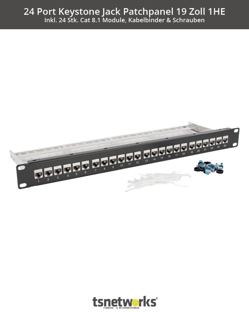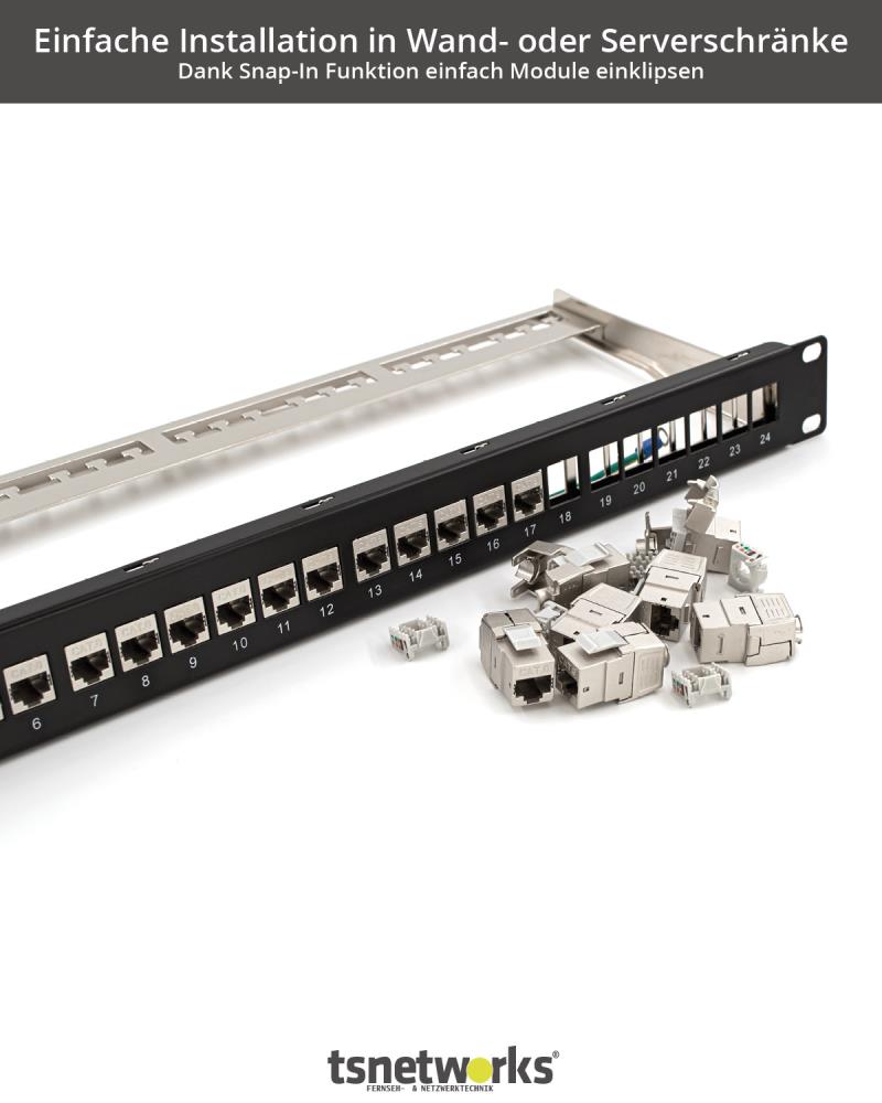 - Modulares 24 Port Patchpanel Patchfeld zum Bestücken mit Keystone Modulen, 24x Keystone Jack Module Cat. 8.1 inklusive, einfache Montage dank Snap-In Funktion.