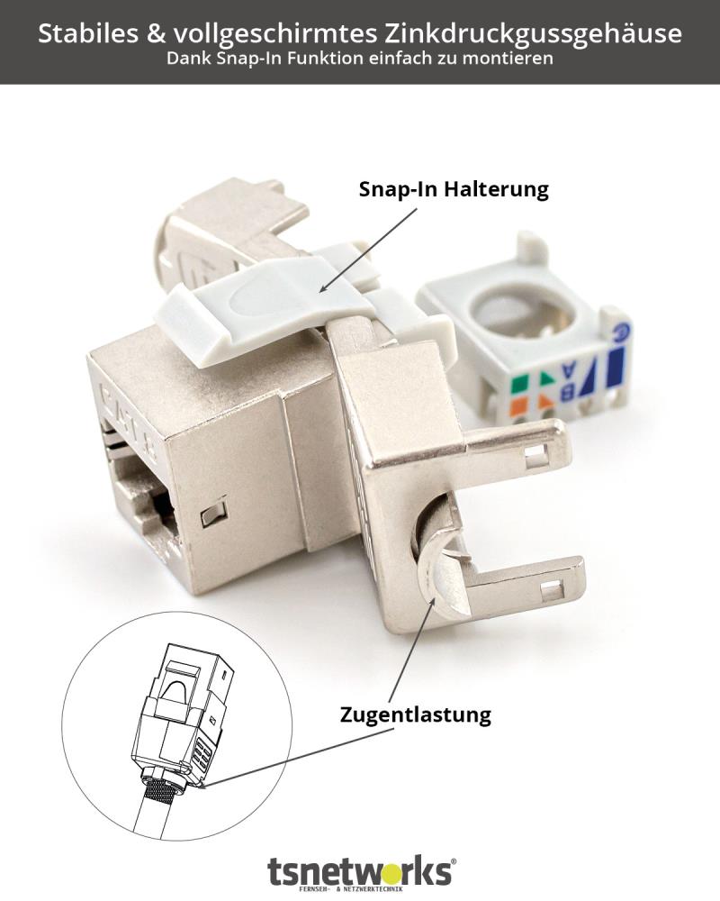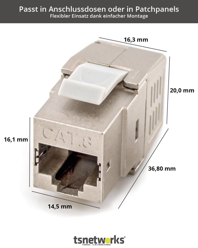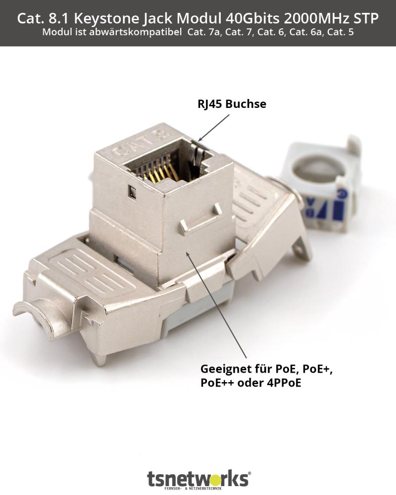 - Das vollgeschirmte Cat. 8.1 Keystone Modul mit stabilem Zinkdruckgussgehäuse unterstützt Übertragungsgeschwindigkeiten von bis zu 40 GBit/s, 2000 MHz in Verbindung mit Cat. 8 Verlegekabel.