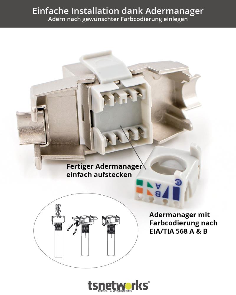 - Werkzeugfreies Auflegen von starren oder flexiblen Adern mit einem Kabeldurchmesser von 5,5 – 9 mm AWG22-24 farbcodiert nach EIA/TIA 568 A & B, Kabel-Fixierung erfolgt per Kabelbinder.