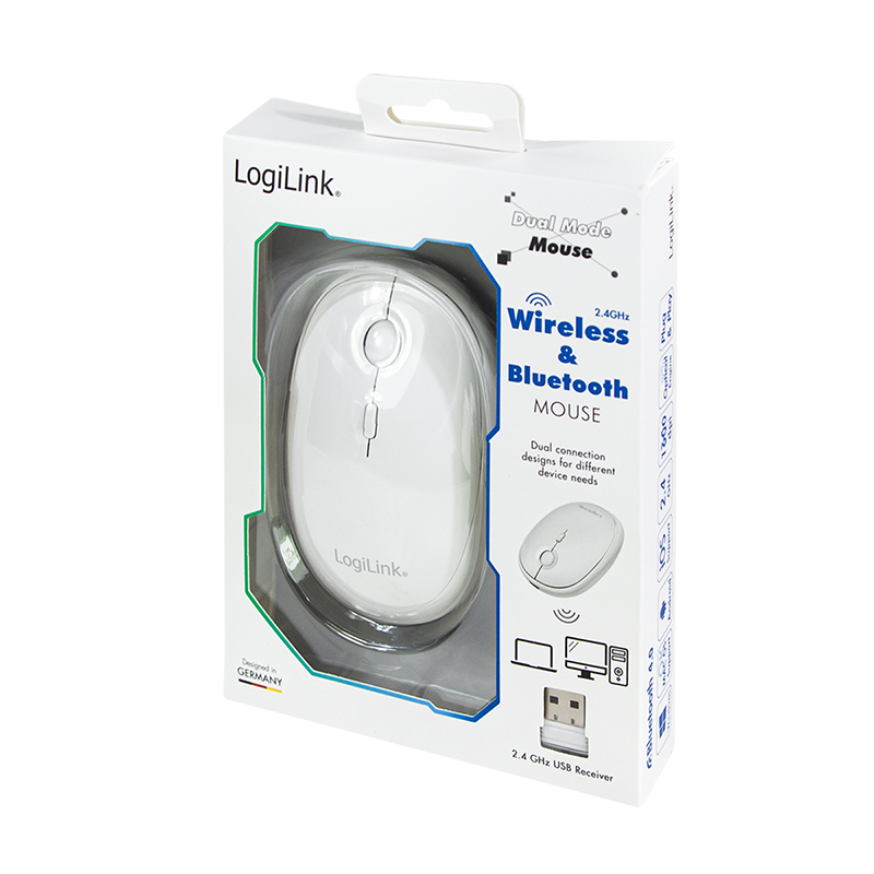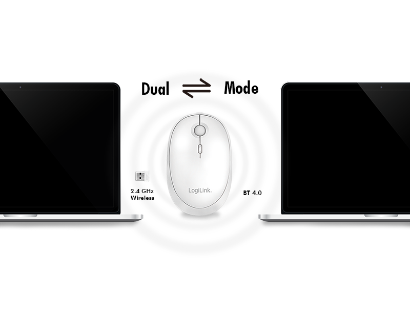 Die LogiLink-Dualmodus-Maus ermöglicht Ihnen eine kabellose Verbindung entweder über BT oder mit dem mitgelieferten 2,4-GHz-USB-Empfänger. Wechseln Sie frei zwischen zwei Rechnern, indem Sie den Modusschalter drücken. Wenn Sie auf der Suche nach einer einfachen, unkomplizierten und zuverlässigen Maus sind, ist die ID0204 in schwarz oder die ID0205 in weiß die Richtige.