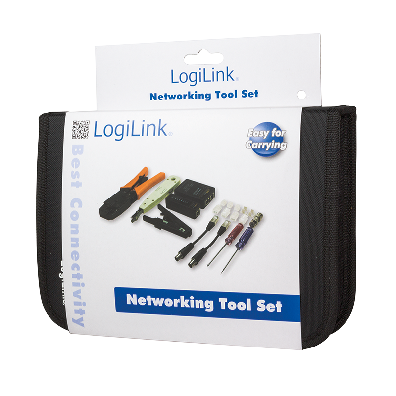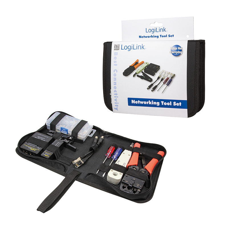 Praktisches Netzwerk-Werkzeugset von LogiLink bestehend aus Crimpzange mit Kabelschneider, LSA-Auflegewerkzeug, Netzwerk-Kabeltester und Abisolierzange mit Kabelschneider. In der kompakten Tasche mit Befestigungssystem haben alle Werkzeuge Platz und sind vor Schmutz und Beschädigung geschützt.